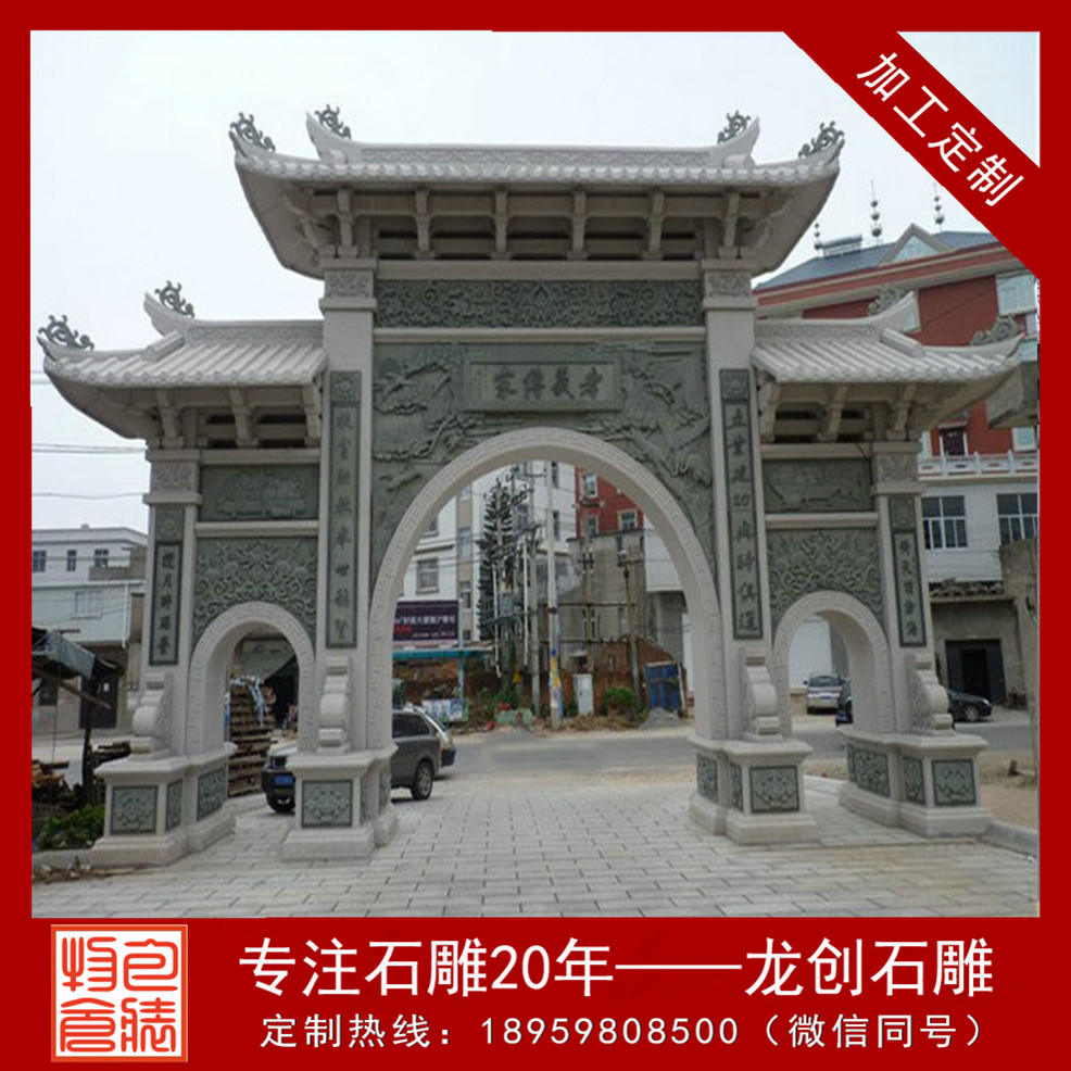 石牌坊制作廠家龍創(chuàng)石雕為您引見村口石牌坊。