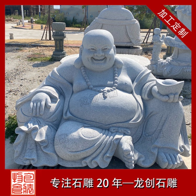現(xiàn)在人們說到石雕彌勒佛佛像,印象深刻的就是他那張充滿笑容的臉,而這樣的彌勒佛我們稱之為笑口常開彌勒佛,而這種形態(tài)的石雕彌勒佛雕像從漢朝進(jìn)入中國以來就這樣固定化了,人們用一位胖胖的中年人來寓意彌勒佛,一來是這樣的偉家見能得到人們的喜愛,二來也是因?yàn)槲磥矸鸬淖饔镁褪亲屖澜绯錆M歡笑吧,三來也是教導(dǎo)人們凡事都應(yīng)該用笑去面對未來。