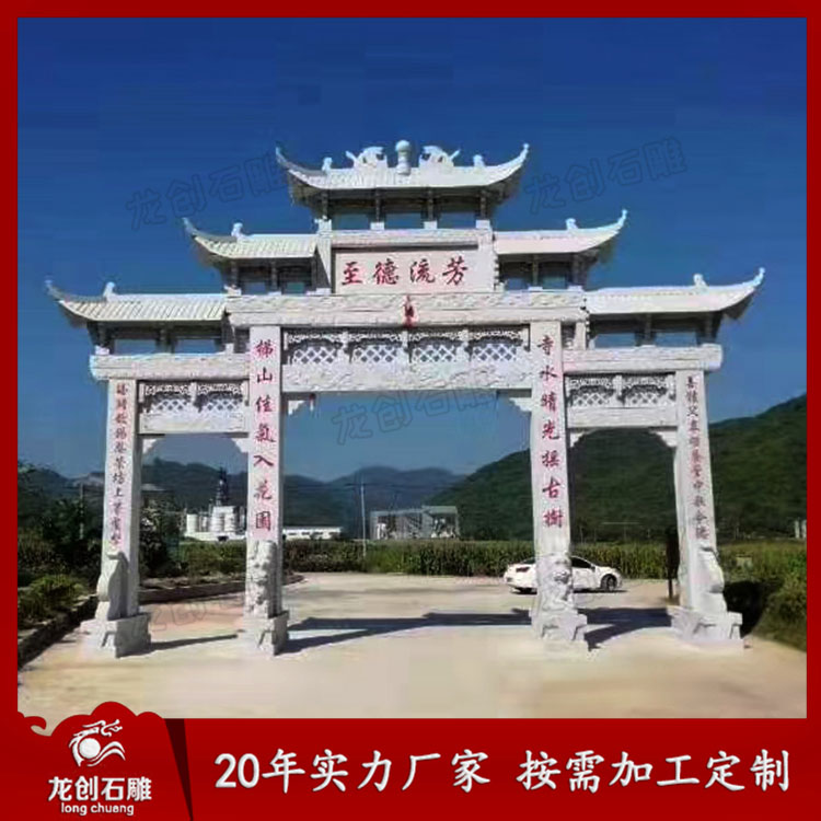 三門石雕牌坊在農(nóng)村地區(qū)也是比較常見的,三門五樓牌坊定制也比較多,尤其是現(xiàn)代一些新農(nóng)村建設(shè)中更是經(jīng)常可以看到這類三門石牌坊設(shè)計的農(nóng)村石牌坊。農(nóng)村地區(qū)的牌坊通常起到了標志地名以及裝飾性作用,在實際雕刻的時候應當要考慮到農(nóng)村地區(qū)的特色以及風土人情等情況,從而能夠雕刻出更為精致的石雕牌坊作品,展現(xiàn)牌坊的建筑之美。