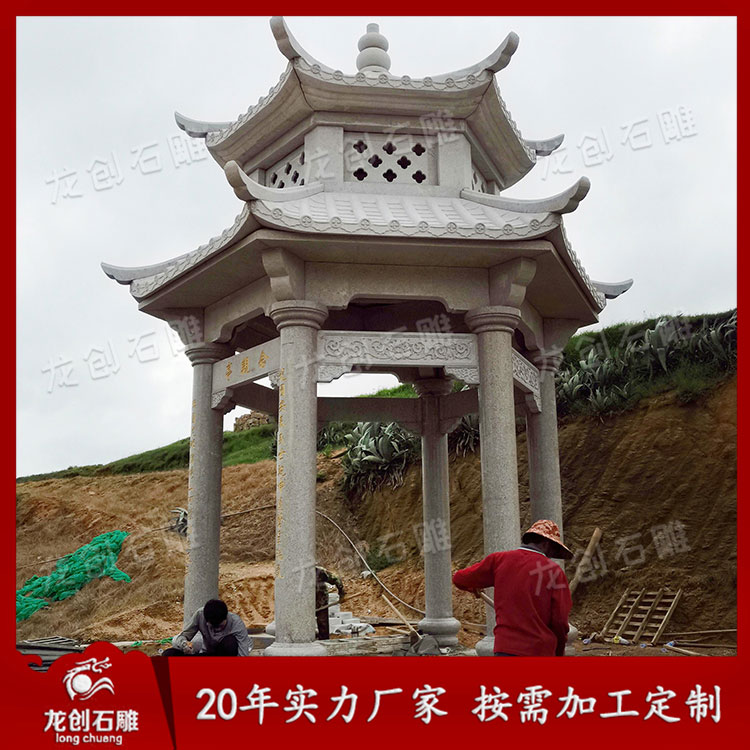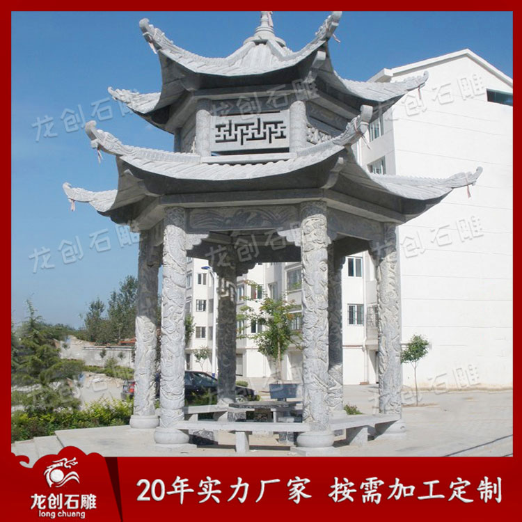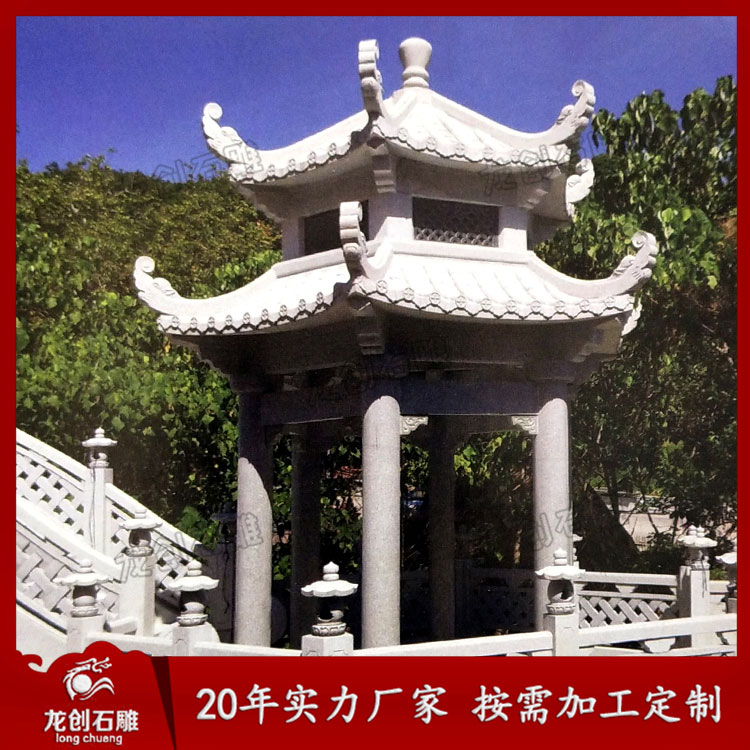 石雕雙層涼亭作為一種景觀建筑,經(jīng)常的與空間環(huán)境作為主題形式出現(xiàn)。這樣我們可以從各個(gè)角度欣賞。但是它又不是一個(gè)實(shí)體,更多地強(qiáng)調(diào)其虛空的內(nèi)部與周?chē)目臻g環(huán)境之間的聯(lián)系,這樣就通過(guò)建筑造型的外在形象,在周?chē)臻g中起到點(diǎn)睛的作用。它追求的是一種整體美、自然美、古典美。