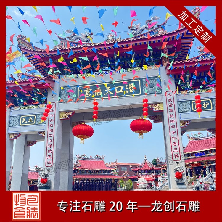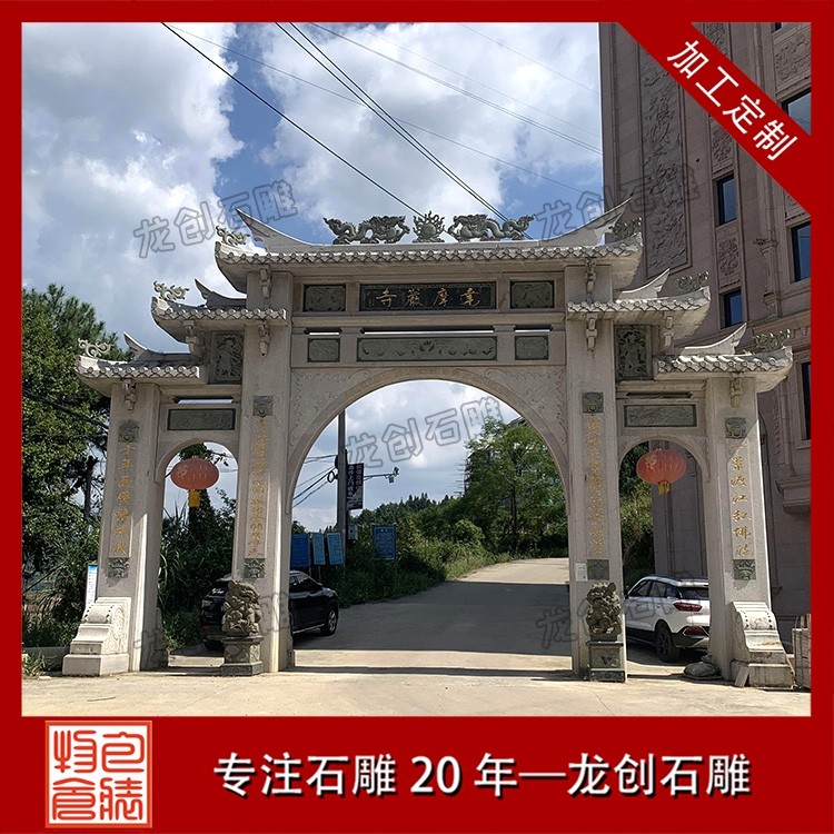 寺廟牌坊的風格通常更為莊重古樸,色彩素雅,營造出一種肅穆的氛圍。當信徒或游客穿過牌坊的那一刻,仿佛從喧囂的俗世踏入了一片清涼圣境,世俗的煩惱被拋在身后,內(nèi)心自然而然地生出敬畏與虔誠 。牌坊上的雕刻也極具宗教特色,常見的圖案不是凡間的飛禽走獸,而是具有佛教寓意的蓮花(象征圣潔)、八寶(象征吉祥) 等。它既是寺廟的標志,也是引導眾生走向覺悟的精神前奏 。