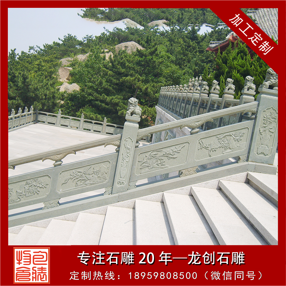 石雕欄桿不僅有安全維護(hù)作用,具有很好的裝飾效果。望柱柱頭常做成回雌形式,題材多為寓意吉祥的勸物、花頭等立體型;菊柱多飾成荷葉凈瓶形式,尋杖以線腳裝飾;欄板是重點(diǎn)裝飾的部分,常施以扮致的雌飾,題材廣泛,并與拄頭的內(nèi)容相呼應(yīng)。由立柱、墊塊、柱頭、抱鼓、欄板組成的石欄桿有時(shí)尚、環(huán)保、美觀、不變形、抗老化的優(yōu)點(diǎn),所以被廣泛應(yīng)用于交通橋梁、水利、公園等護(hù)欄工程。它的種類多種多樣,各種石材都可制作,常見的還是漢白玉欄桿、花崗石欄桿和青石欄桿。