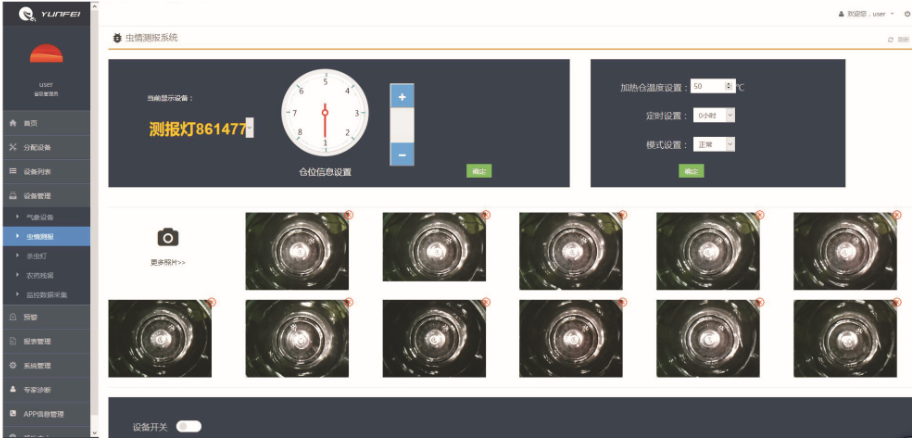遠(yuǎn)程蟲情分析測報(bào)儀利用現(xiàn)代光、電、數(shù)控技術(shù),實(shí)現(xiàn)了在無人監(jiān)管的情況下,能自動(dòng)完成誘蟲、殺蟲、收集、分裝、排水等系統(tǒng)作業(yè),通過GPRS移動(dòng)無線網(wǎng)絡(luò),定時(shí)拍照采集接蟲盒內(nèi)收集的蟲體圖片,自動(dòng)上傳到遠(yuǎn)程物聯(lián)網(wǎng)監(jiān)控平臺(tái),平臺(tái)每天自動(dòng)記錄采集數(shù)據(jù),形成蟲害數(shù)據(jù)庫,可以通過數(shù)據(jù)列表和圖表的形式展現(xiàn),工作人員可隨時(shí)遠(yuǎn)程了解以蟲體的情況和變化,制定防控措施。