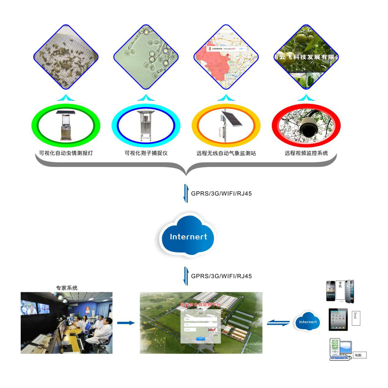 監(jiān)測預(yù)警系統(tǒng)由無線墑情監(jiān)測站、苗情監(jiān)控攝像頭、可視化自動蟲情測報燈、災(zāi)情視頻監(jiān)控攝像機、預(yù)警預(yù)報系統(tǒng)、專家咨詢系統(tǒng)、用戶管理平臺組成。用戶可以通過移動端和PC端隨時隨地登陸自己專屬的網(wǎng)絡(luò)客戶端,訪問田間的實時數(shù)據(jù)并進行系統(tǒng)管理,對每個監(jiān)測點的環(huán)境、氣象、病蟲狀況、作物生長情況等進行實時監(jiān)測。結(jié)合系統(tǒng)預(yù)警模型,對作物實時遠程監(jiān)測與診斷,并獲得智能化、自動化的解決方案,實現(xiàn)作物生長動態(tài)監(jiān)測和人工遠程管理,保證農(nóng)作物在適宜的環(huán)境條件下生長,提高農(nóng)業(yè)生產(chǎn)力,增加農(nóng)民收入。